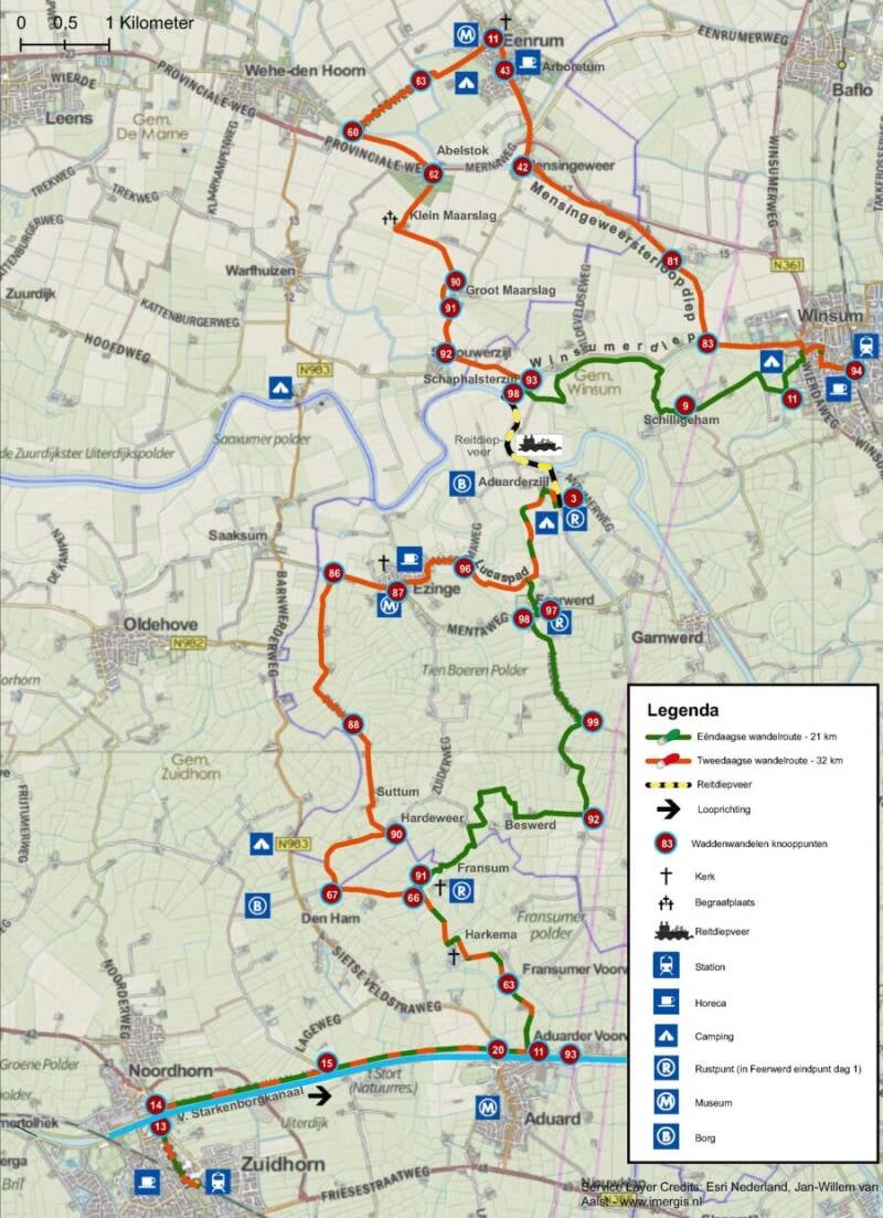 Er zijn 2 nieuwe wandelroutes uitgezet die lopen door Middag-Humsterland en het Hogeland. De ongeveer 15 minuten durende overtocht met het Reitdiepveer (fiets- en voetveer) is onderdeel van beide wandelingen. Loop de 1- daagse wandeling van 21 km of neem de 2- daagse route van 2 maal 16 km. Beide wandelroutes gaan van Station Zuidhorn naar Station Winsum, of andersom